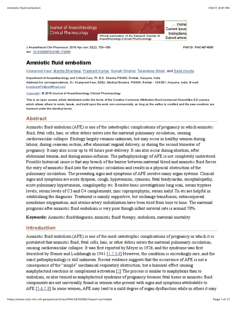 AMNIOTIC FLUID EMBOLISM PDF Childbirth Medical Specialties