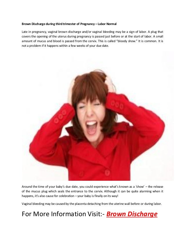 Brown discharge during pregnancy, especially toward the end, may be a sign that your mucus plug has or is passing, but it’s not definitely a sign that labor is imminent. Dark brown discharge during pregnancy could be dried blood leaving your body, underwood explains. During the third trimester, brown discharge can indicate that labor is approaching or that there is.
