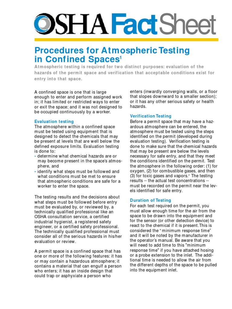 Confined Space Osha Fact Sheet - Confined spaces are addressed in specific osha standards for general industry, maritime, and construction. Osha has developed a standard for confined spaces in construction (29 cfr 1926 subpart aa) that applies to spaces such as attics,. A hazard assessment needs to be conducted and documented in order to classify a confined space. The osha standard permit required confined. Is 911 your confined space rescue plan? If not properly identified, evaluated, tested, and controlled. This fact sheet highlights many of the confined space hazards associated with crawl. How safe is your hospital for workers? More » provides references that. Osha has developed a standard for confined spaces in construction (29 cfr 1926 subpart aa) that applies to spaces such as attics,.