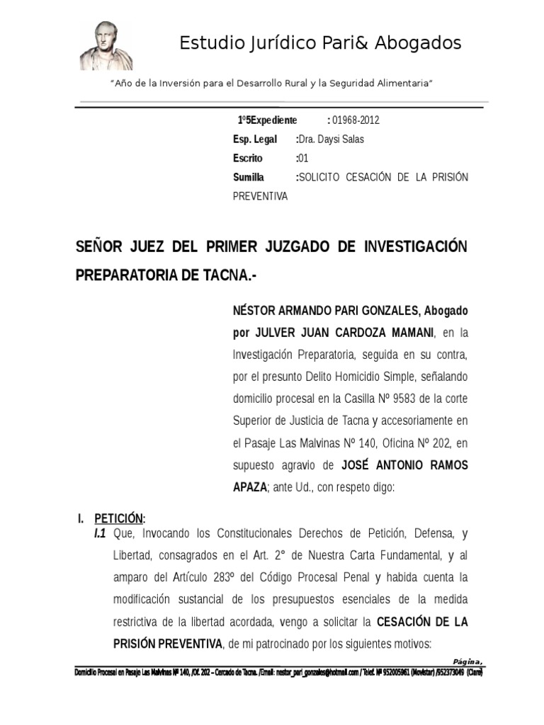 Memorial Cesación A La Detención Preventiva PDF Justicia penal
