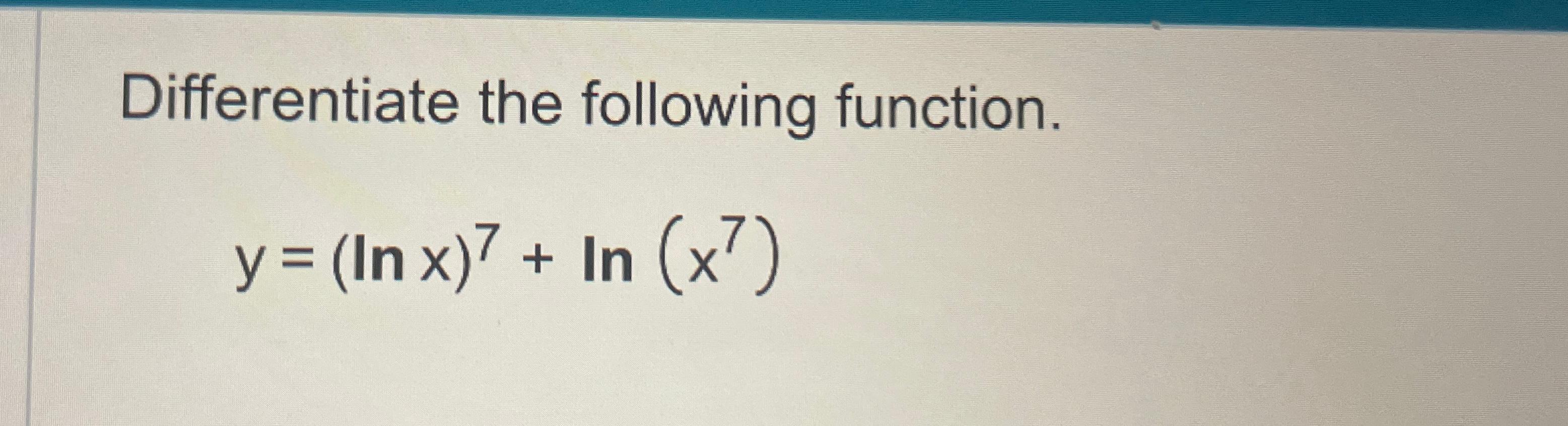Solved Differentiate the following function.y=(lnx)7+ln(x7)