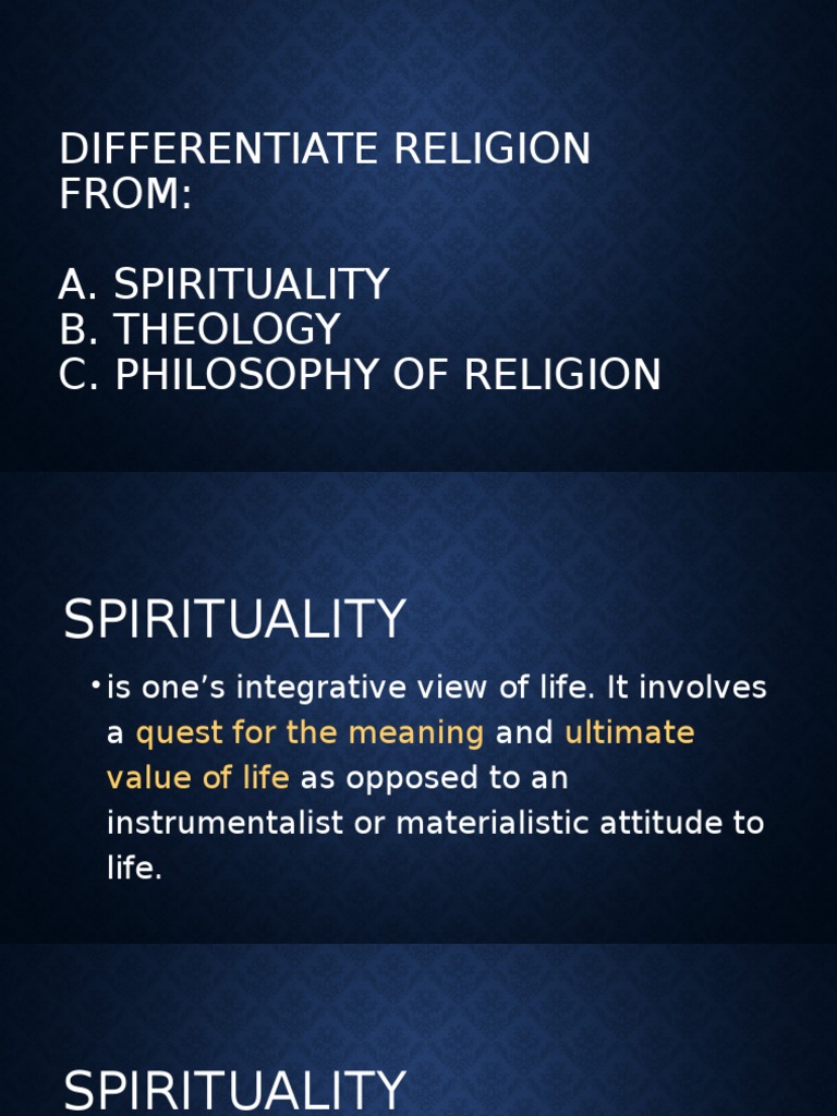 Differentiate Religion From A. Spirituality B. Theology C. Philosophy