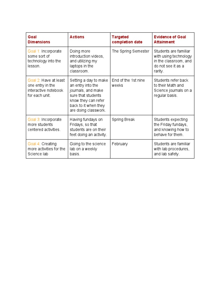 What impact will these goals have on teacher and student performance? What are the specific actions necessary for the goals be.