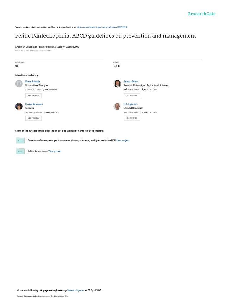 Feline Panleukopenia. ABCD Guidelines On Prevention and Management