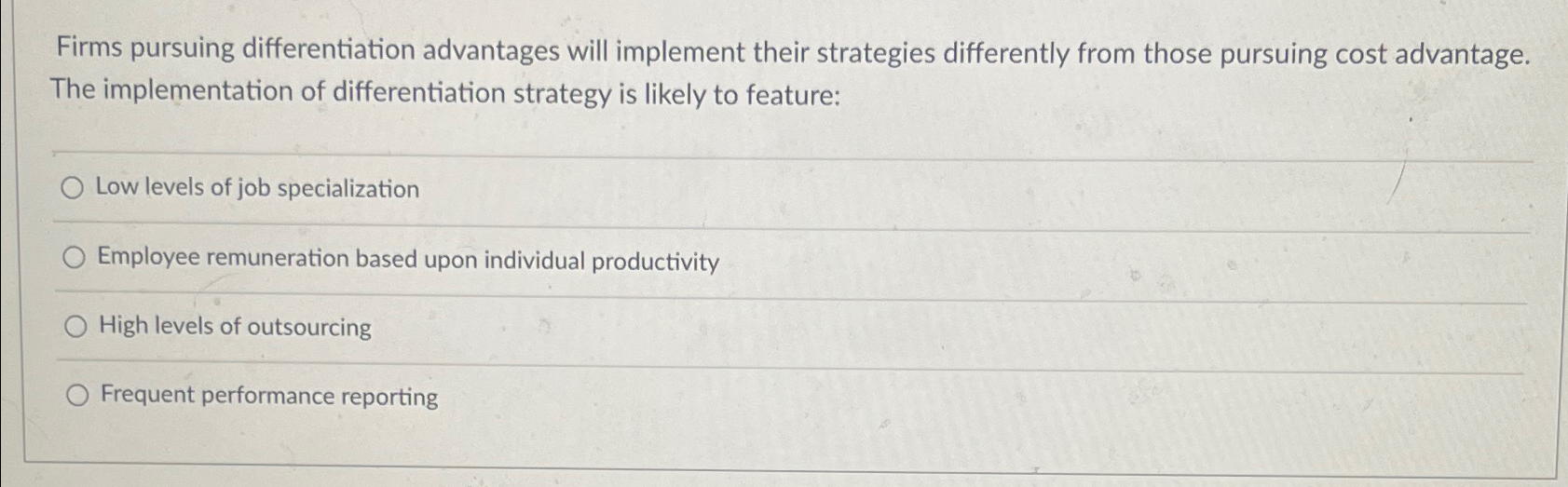 4) firms pursuing a differentiation strategy primarily seek to: A) keep their cost structures lower than that of the cost leader. Firms pursuing a differentiation strategy primarily seek to: Study with quizlet and memorize flashcards containing terms like firms pursuing a differentiation strategy primarily seek to: