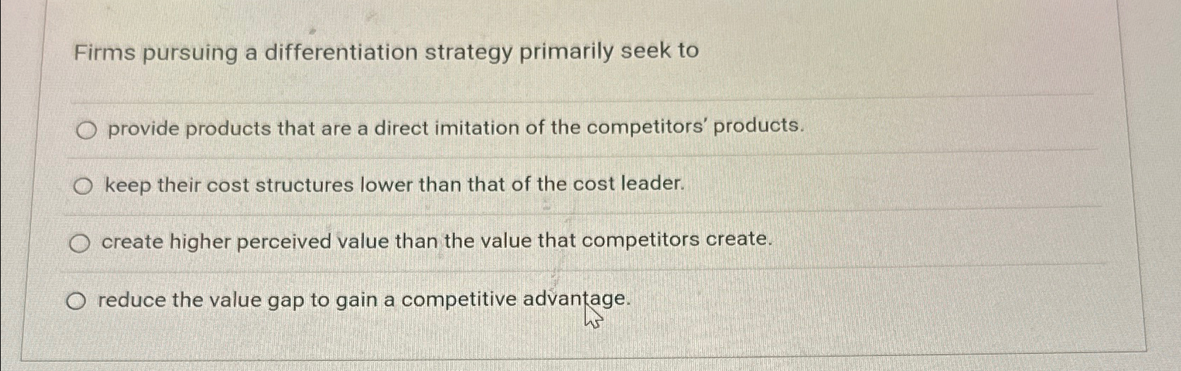Firms pursuing a differentiation strategy primarily seek to: Keep their cost structures lower than that of the cost leader. 4) firms pursuing a differentiation strategy primarily seek to: Study with quizlet and memorize flashcards containing terms like firms pursuing a differentiation strategy primarily seek to: By creating higher perceived customer value, firms pursuing a differentiation strategy can establish customer loyalty,.
