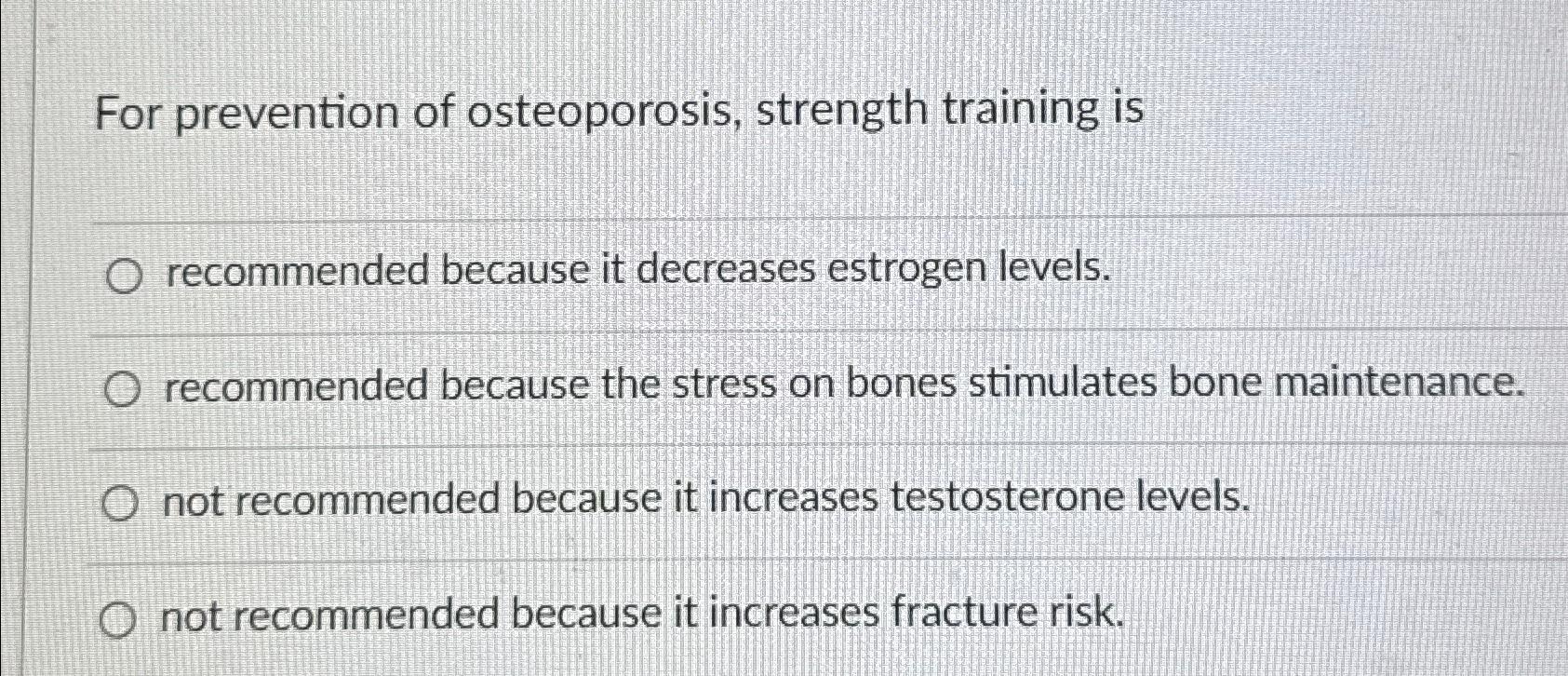 B) strength and balance training rationale: Strength and balance training is the safest, most appropriate plan for exercise for the visually. Strength training determines an increase in specific site bone density, in particular at the neck of the femur and at the lumbar spine, which is. An exercise program for osteoporosis should include four components: Study with quizlet and memorize.