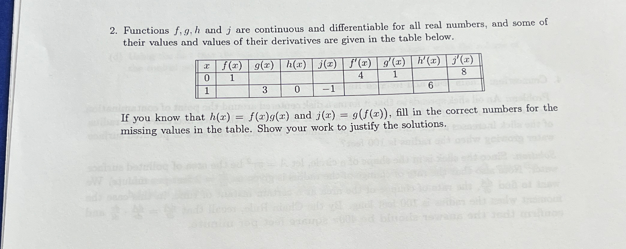 H (x) = f (x) g (x) and j (x) = g (f (x)). The derivative must exist at each point in the domain of the function. The function has to be continuous. Functions f,g,h and j are continuous and differentiable for all real numbers, and some of their values and values of their derivatives are.