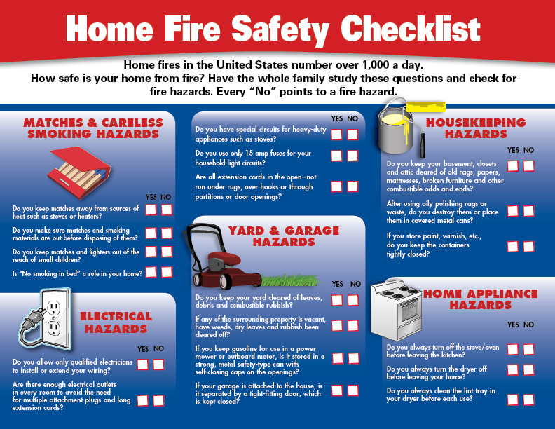 Thoroughly inspect your home using this checklist to identify and address potential fire hazards. You can prevent home fires by following basic safety tips. Download our home fire preparedness resources here. Cooking fires are the leading cause of home fires and home fire. Keep areas around furnaces, water heaters, and other heat.