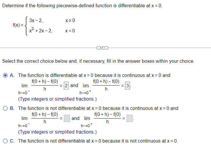 Generally, if you graph a piecewise function and at any point it doesn't look smooth (there's a. S ↦ r where s = s ∘ ⊆ r, x ∈ s. (differentiable and gradient) let f: $f(x)$ is differentiable at $x=1$ for the unique values of $a$ and $b$.