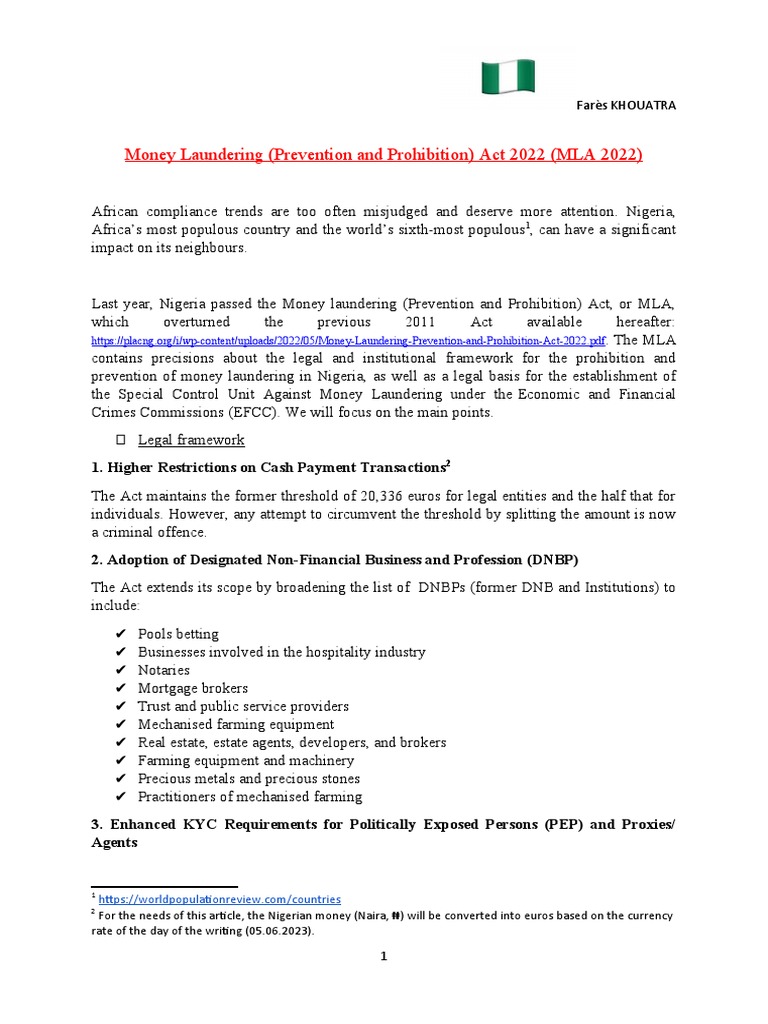 Money Laundering (Prevention and Prohibition) Act 2022 (MLA 2022) PDF