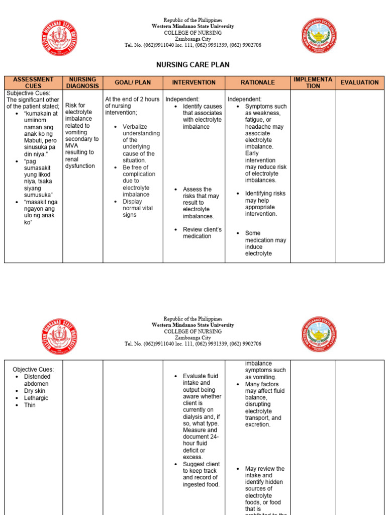 SOLUTION Risk for electrolyte imbalance nursing care plan Studypool