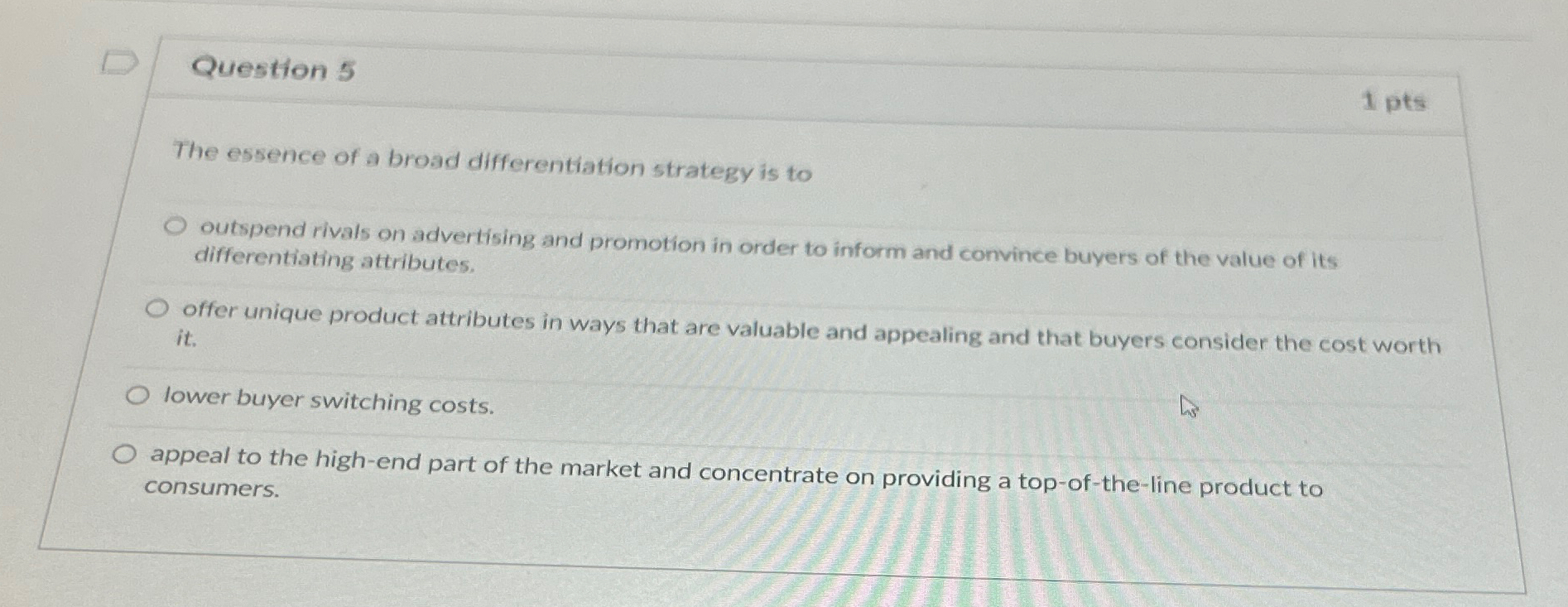 Study with quizlet and memorize flashcards containing terms like the essence of a broad differentiation strategy is to, a firm pursuing a. The essence of a broad differentiation strategy is to: Incorporate a greater number of differentiating features into its product/service.