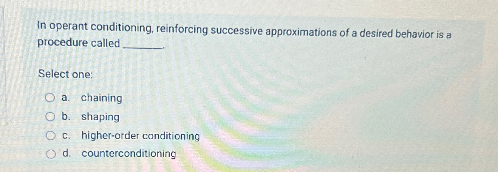 Shaping is a systematic process of reinforcing successive approximations to a target behavior. A process in which an instructor teaches a new behavior by systematically and differentially reinforcing “successive. The process of systematically, differentially reinforcing successive approximations to a terminal behavior is commonly referred to as. Shaping is the process of systematically and differentially reinforcing successive approximations to a terminal.