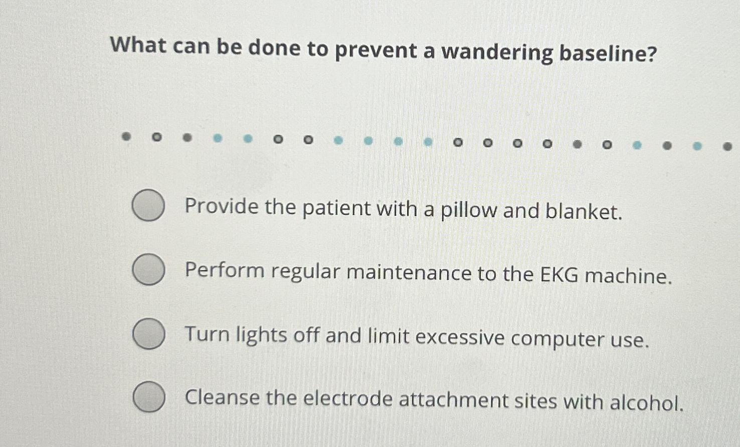 Clean the skin prior to attaching the electrodes and instruct the patient to avoid using creams and lotions to assist in reducing a wandering. To prevent a wandering baseline in ecg readings, it is important to cleanse the electrode sites, ensure proper placement of. To prevent wandering baseline artifact, the medical assistant should ensure the patient is cleansed with alcohol.