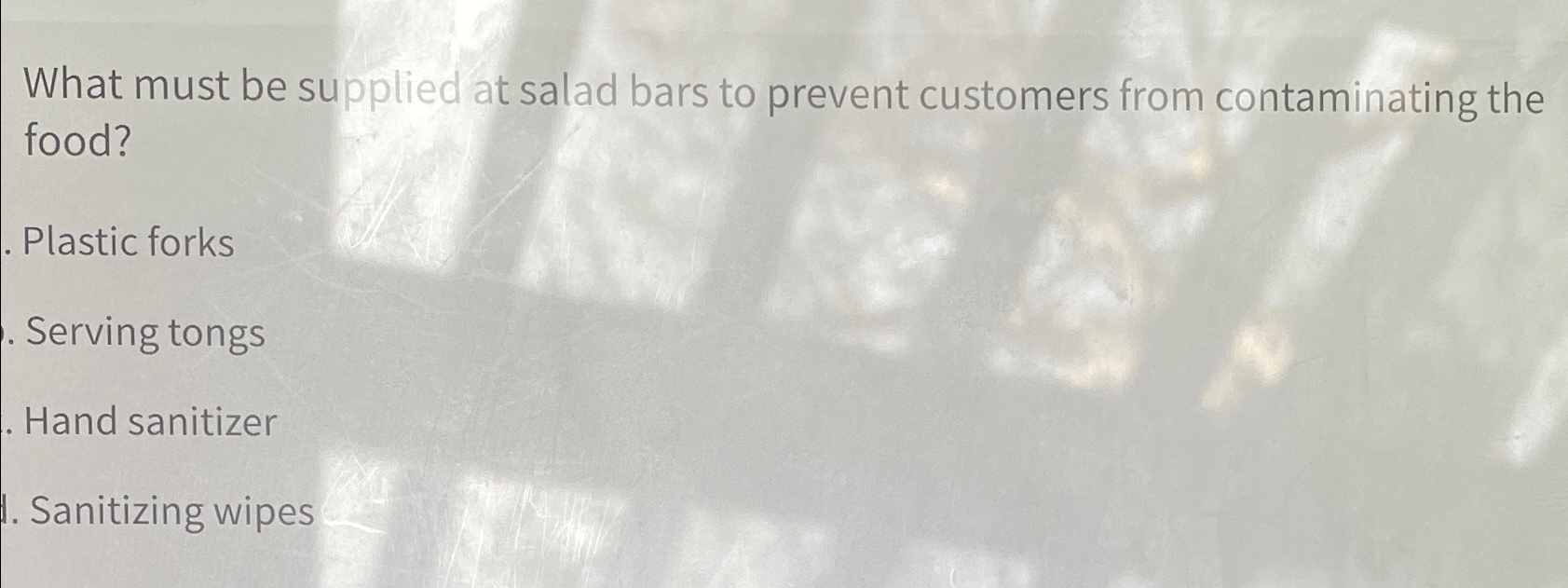 SOLVED What must be supplied at salad bars to prevent customers from