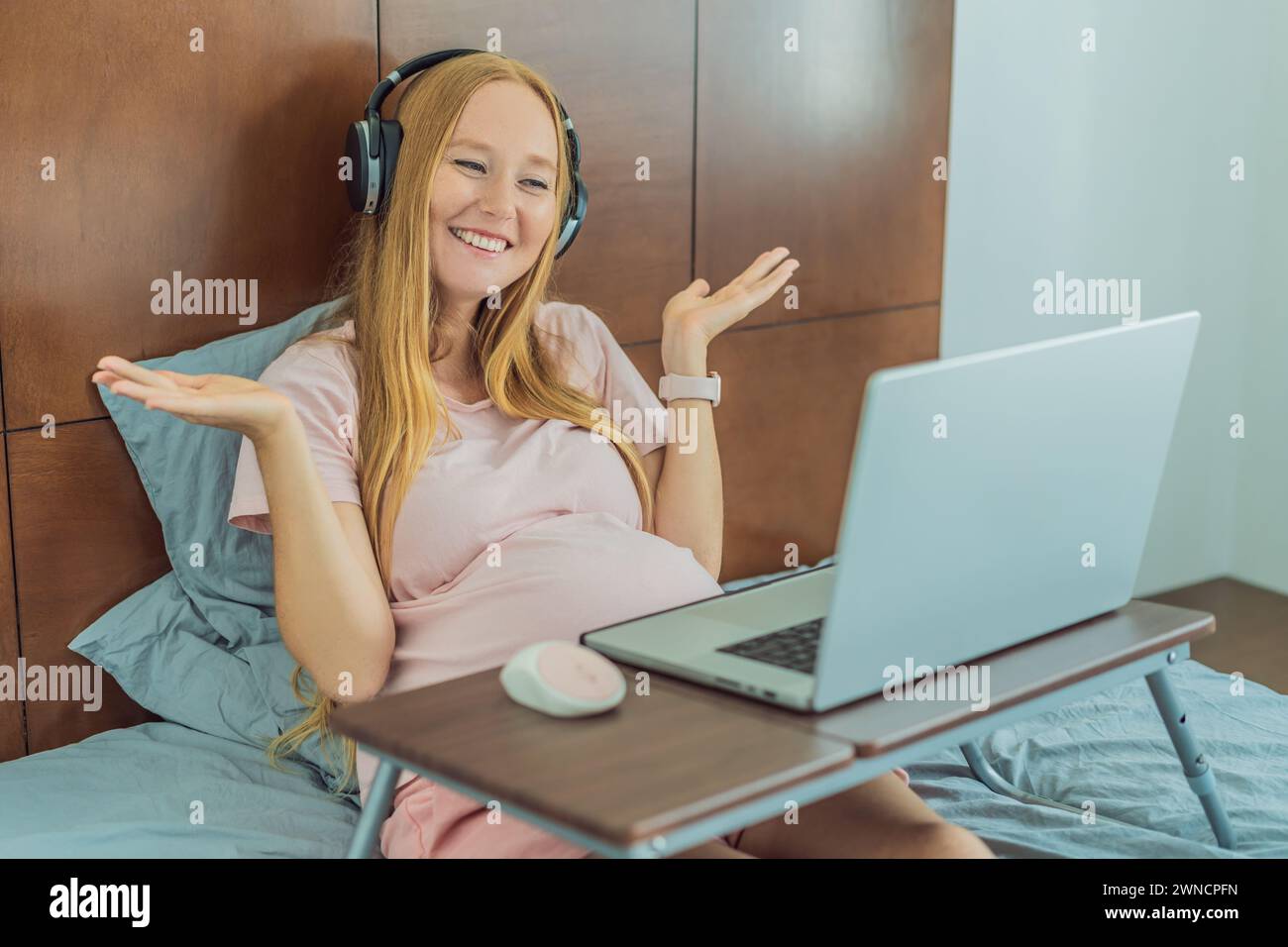 Pregnant woman working on laptop. Expectant woman efficiently works